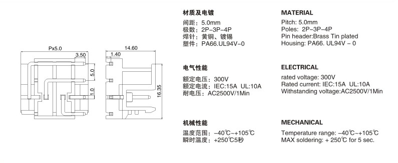 间距:5.0mm;极数:2P-3P-4P;额定电压/电流:300V/IEC:15A UL:10A