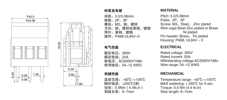 间距:5.0/5.08mm;极数:2P、3P;额定电压/电流:300V/25A